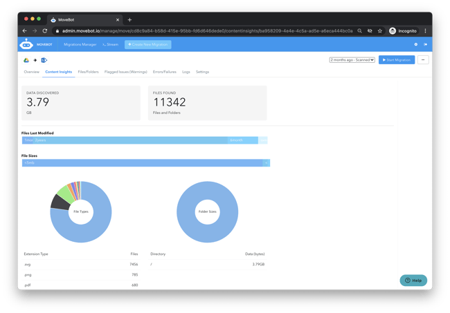 One tool is Movebot's Discovery scan. This scan will provide you with the file and folder structure, sizes, amount of files, they will also provide insights on when the files were last modified and a breakdown on where your data resides within your current infrastructure. It's one of the best ways to understand your data.