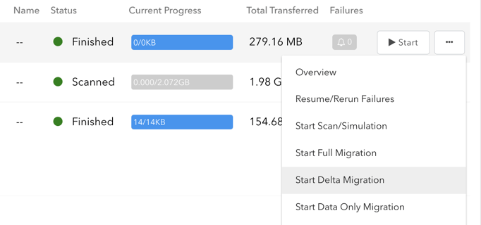 As mentioned above, Movebot doesn't make you move everything, and it's common practice to set up a few transfers and run them simultaneously. After setting up the transfer, you'll get several options for what action to take next including starting a scan, a full migration, delta migration, data only, and more. You can also choose to launch the action immediately or schedule it for later.