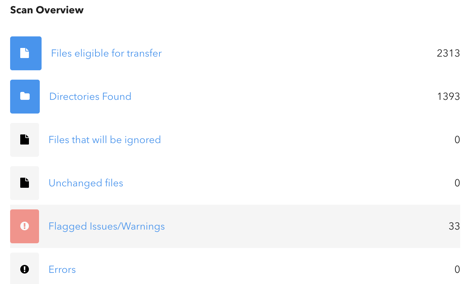 Movebot’s pre-migration scan gives you a lot of important data to review. One of the most important sections to consider is the errors. Errors range from low (Warnings), to Critical depending on the severity. If the scan shows you're likely to have errors in your migration, you can decide if you need to make changes before starting the transfer.