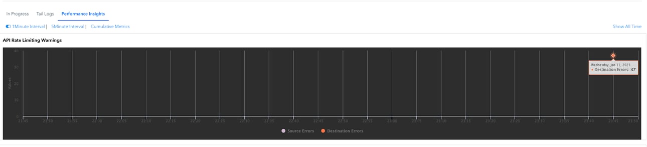 The Performance Tracker provides real-time stats and gives you any recommendations if it believes there is something that is reducing your performance. You can see live stats on metrics such as rate limiting, average upload and download time, errors and error rates, vCPU usage for the moveworkers, and data transfer rates.